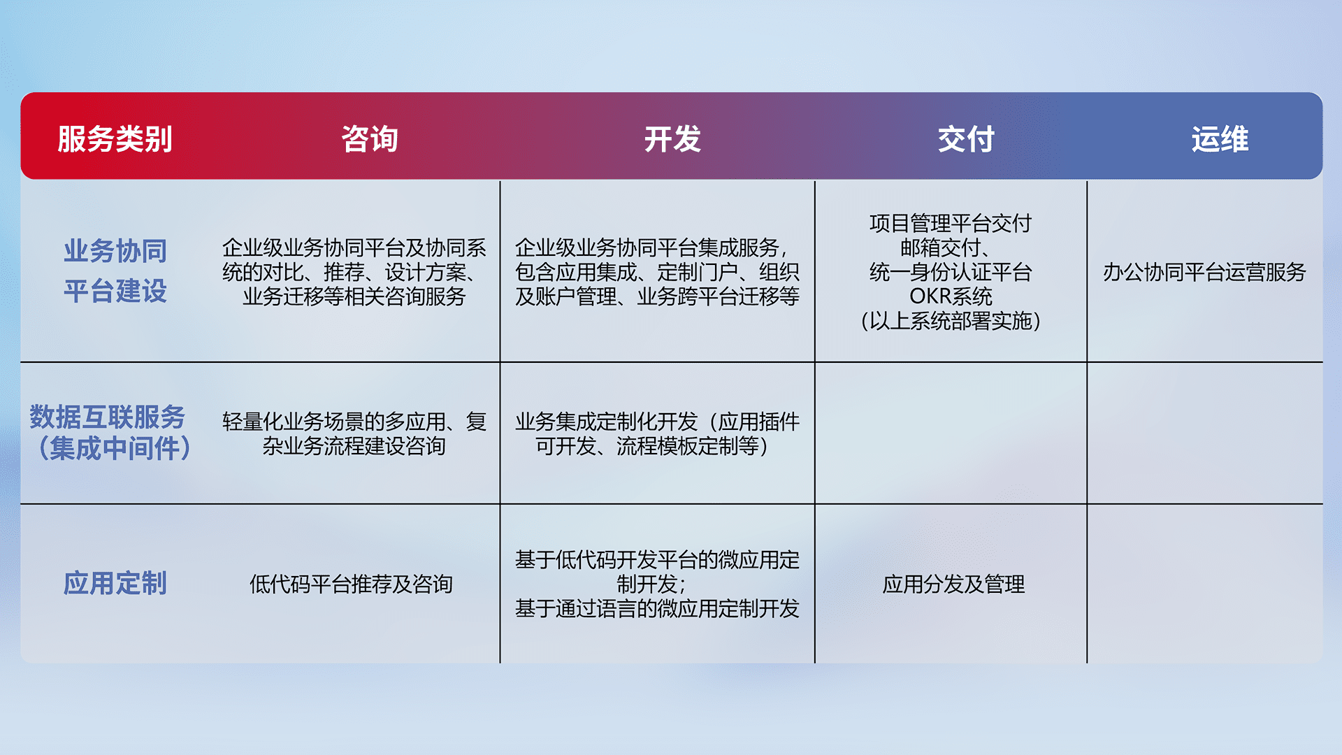 针对钉钉、、、企微、、、、IDaas等平台级产品提供产品的规划、、、方案、、、交付、、、定制化开发等服务,,,,实现如统一协同办公、、、智能客户服务、、混合会议管理、、、、智能数据查询、、等业务场景,,,实现数字化转型。。。。