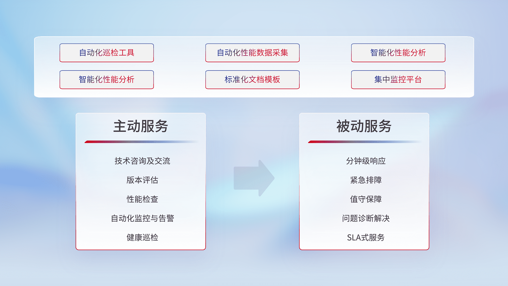 智能化工具和标准化文档,,,保障服务质量,,提供主动服务(包含技术咨询、、、、版本评估、、、性能检查、、自动化监控与告警、、健康巡检)和被动服务包含(分钟级响应、、紧急排障、、、、值守保障、、问题诊断解决、、、SLA服务)。。。。